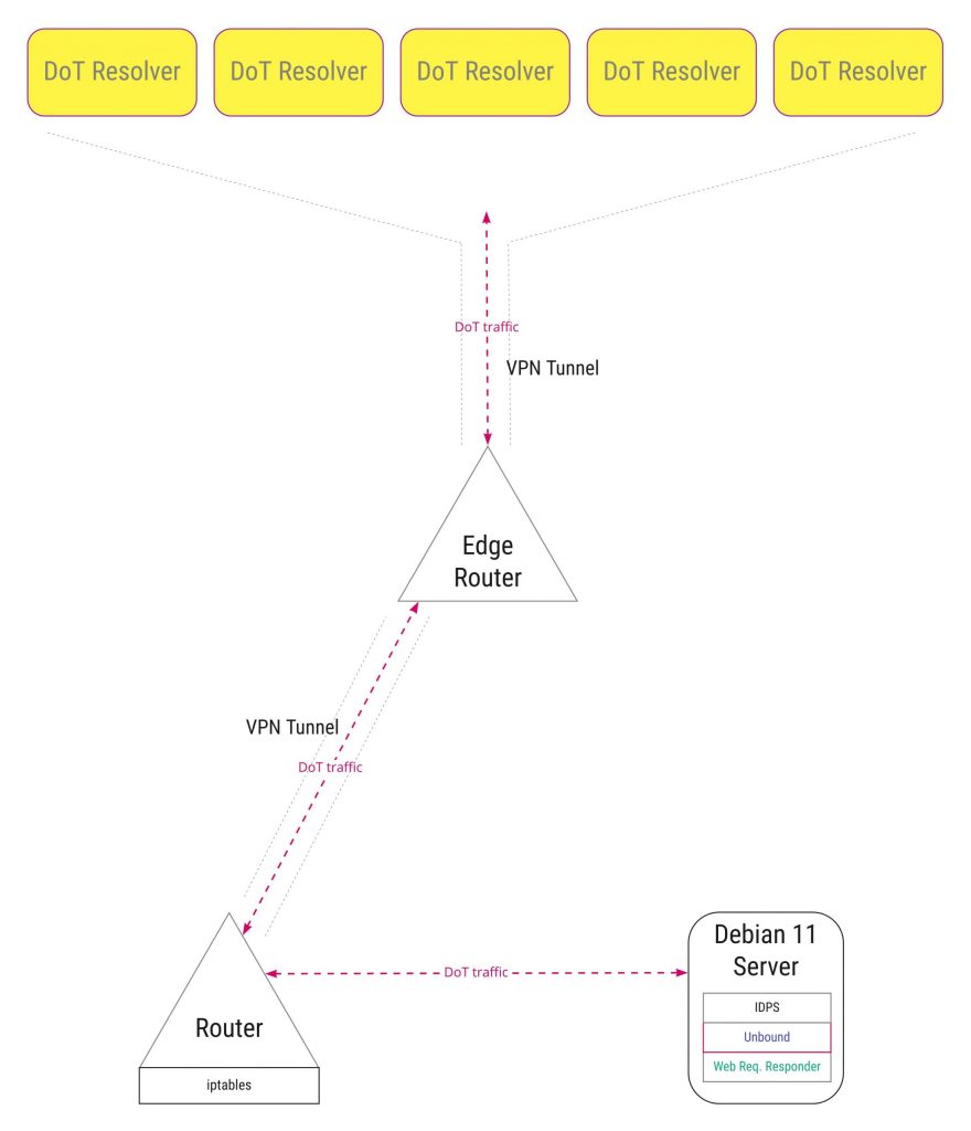 This way the ISP has no connection records or meta-data for the queries we’re sending – which they’d be able to acquire even if they can’t see the content of the queries protected by DoT. Ideally we could funnel our web traffic too, so that they would be unable to collect connection records for that type of traffic.